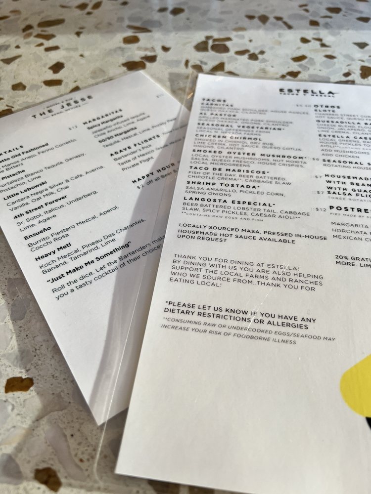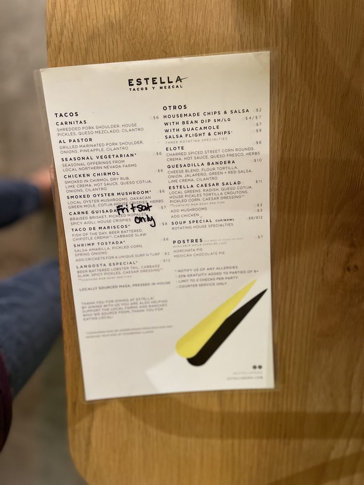 Welcome to Estella, a vibrant gem in downtown Reno, specializing in upscale New Mexican cuisine with a focus on delectable tacos. This women-owned lounge offers a cozy atmosphere, complete with ceiling-to-floor windows, showcasing the lively city vibes. The menu delights with a variety of tacos, from Carnitas and Chicken Chirmol to the innovative Smoked Mushroom, each crafted with fresh ingredients and bold flavors. Customers rave about the fantastic tequila and mezcal selection, complemented by expertly crafted cocktails and a lively happy hour. Accessibility is a priority here, with ADA-compliant entrances, gender-neutral restrooms, and outdoor seating options. Estella is perfect for gatherings, catering to groups with its private dining and catering services. Whether you’re indulging in housemade chips with guacamole or savoring the horchata pie, Estella promises a memorable experience, blending casual dining with an upscale twist.